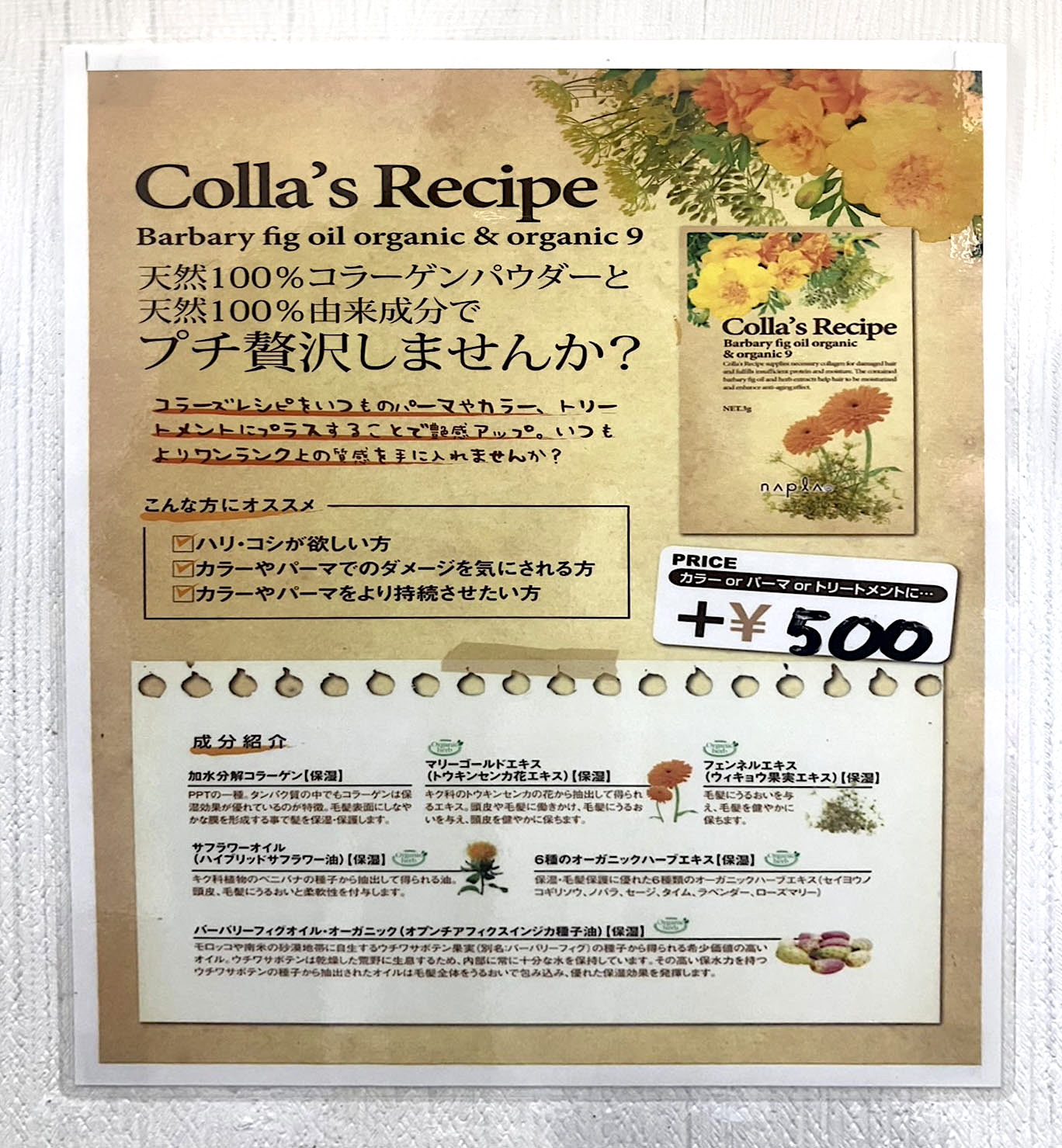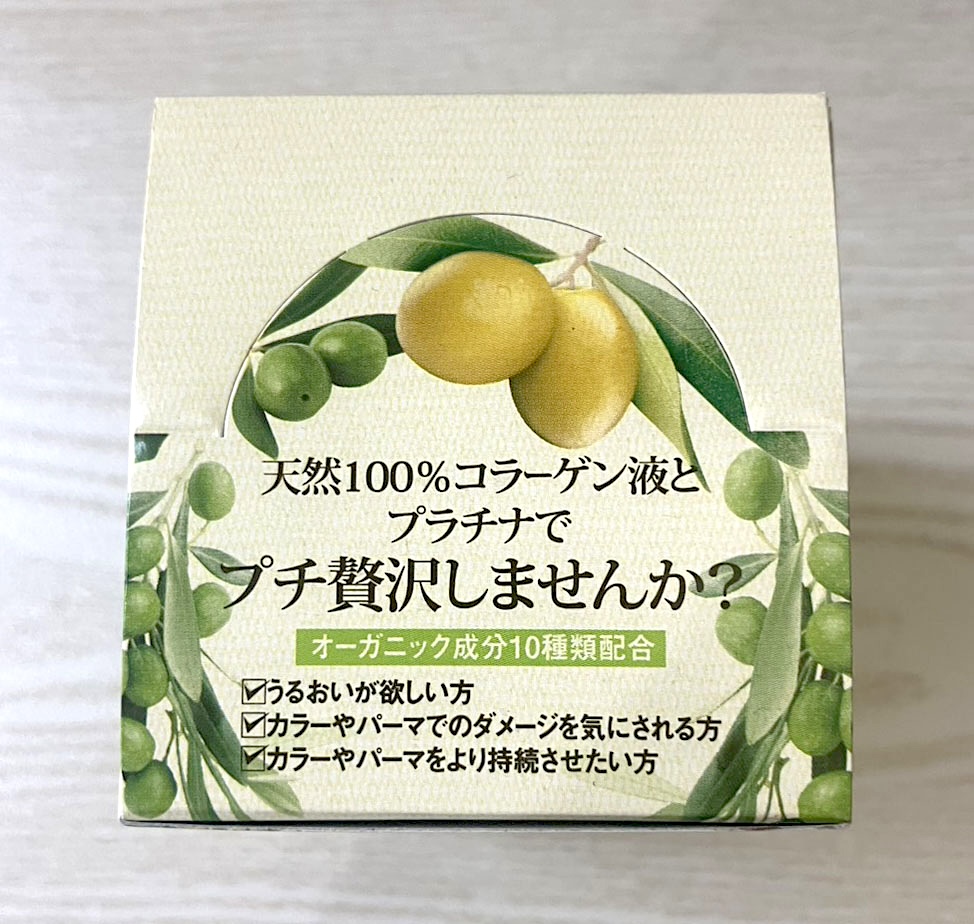 天然成分100%コラーゲン+9種のオーガニックエキスを配合。毛染め剤にあらかじめ混ぜて施術するので、時間はそのままで髪に潤いをプラス。